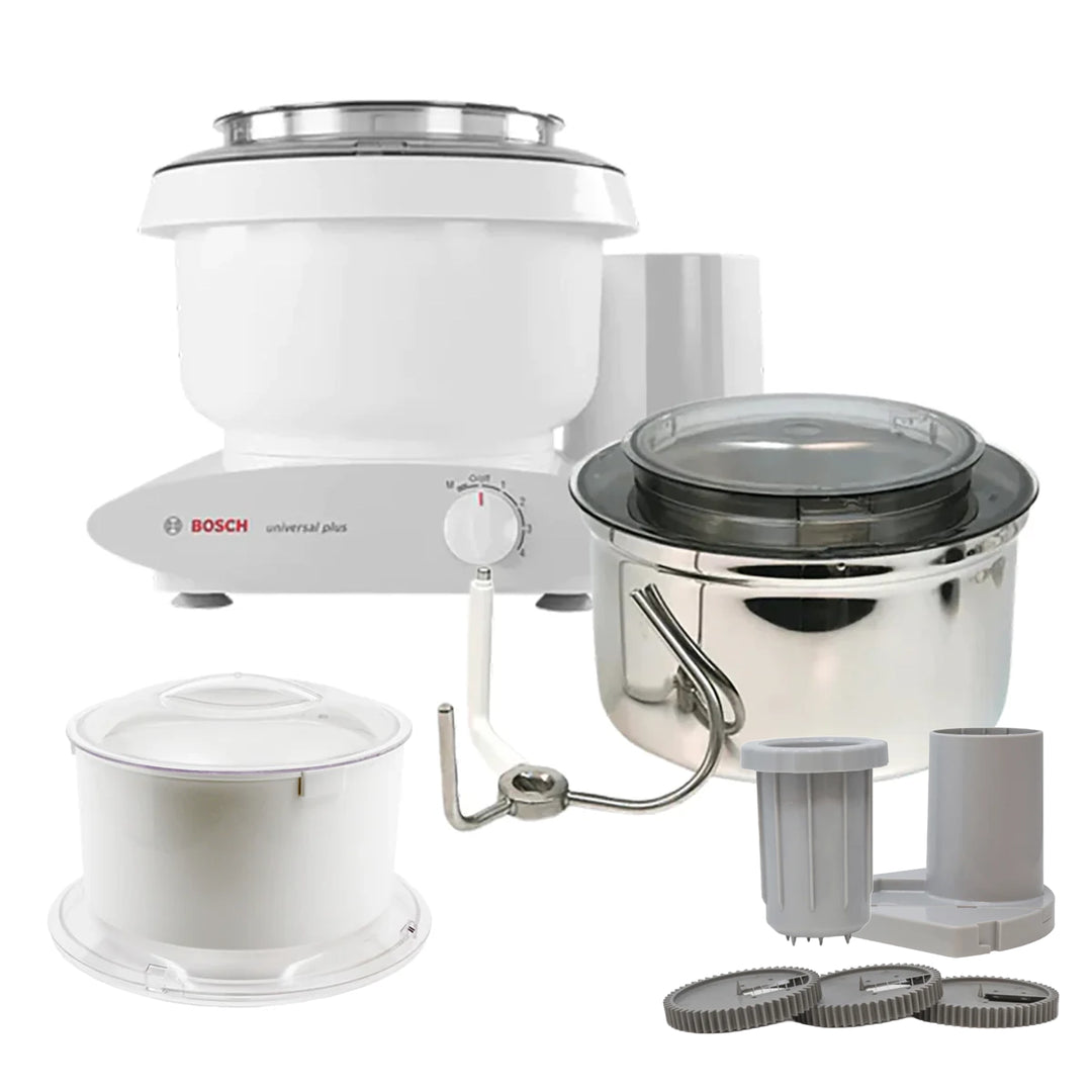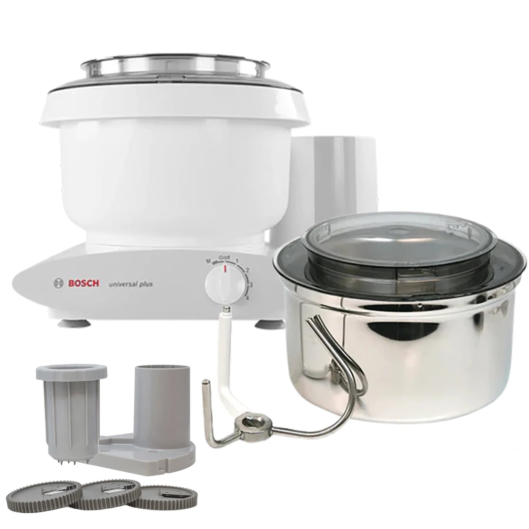 Bosch Universal Plus Mixer with stainless steel bowl for challah and sifter set color: White - With spiralizer