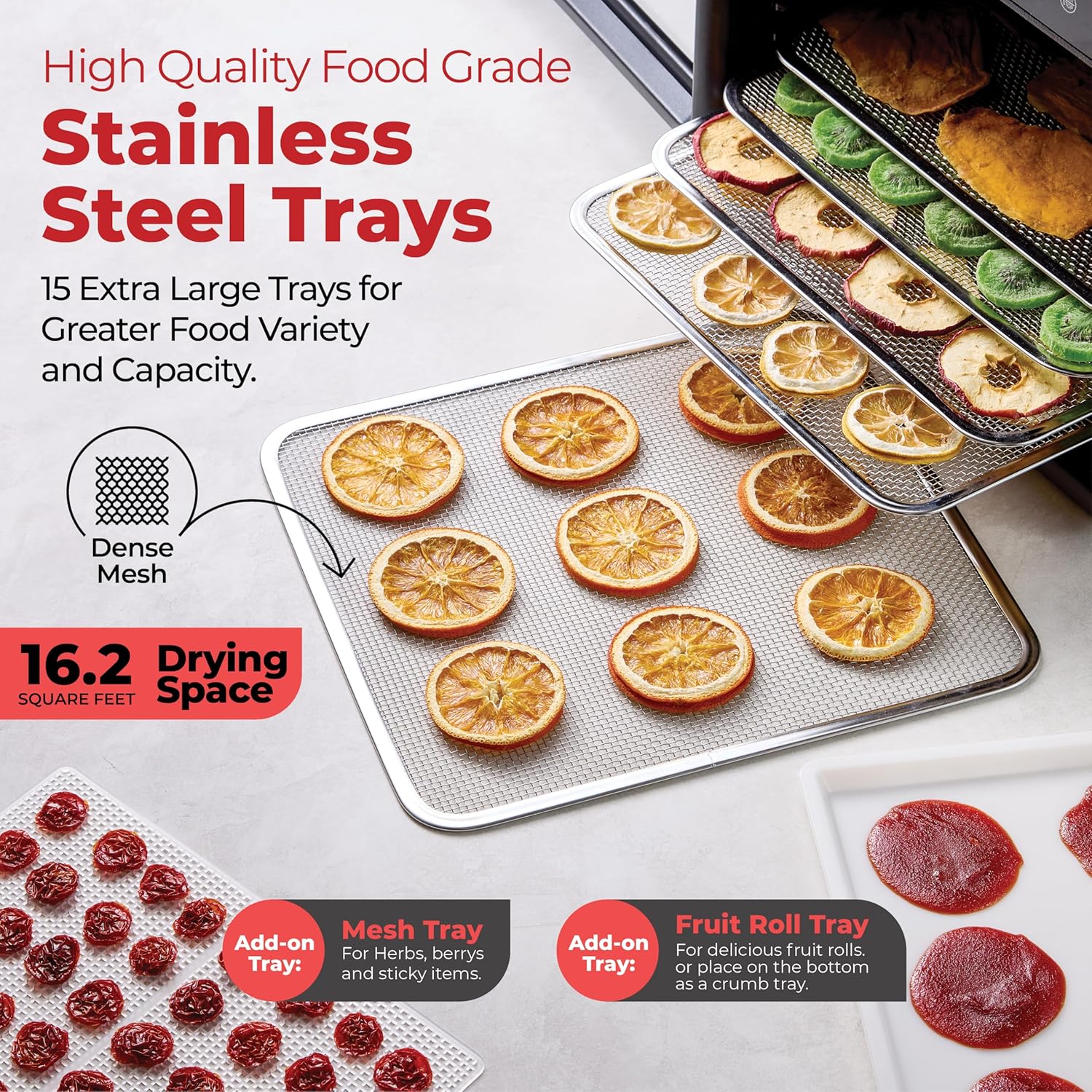 Magic Mill Premium Food Dehydrator Machine (15 Extra-Large Stainless Steel Trays) 800W Dryer for Beef Jerky, Fruits, Vegetables, Dog Treats, 48 Hour Digital Timer - 95°-167° Temperature Control